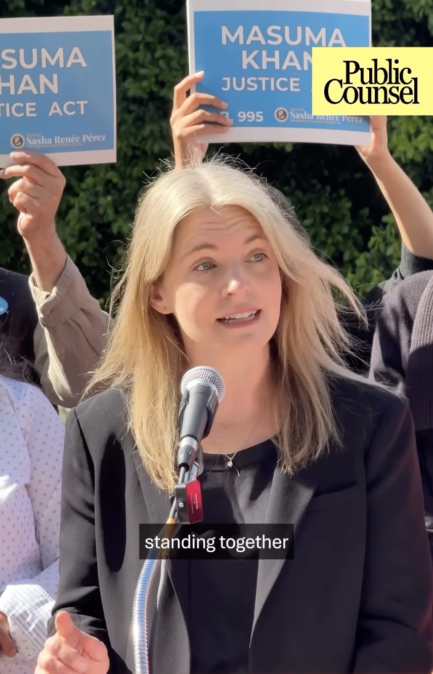 The bill is named in honor of Masuma Khan, a 64-year-old wife, mother, and pillar of her Altadena community, who was detained by ICE last fall despite having no criminal record. During her detention she was denied life-sustaining medications and medical care, adequate food, and appropriate clothing. Working alongside her family and our legal partners, Public Counsel acted quickly to secure Masuma’s release.